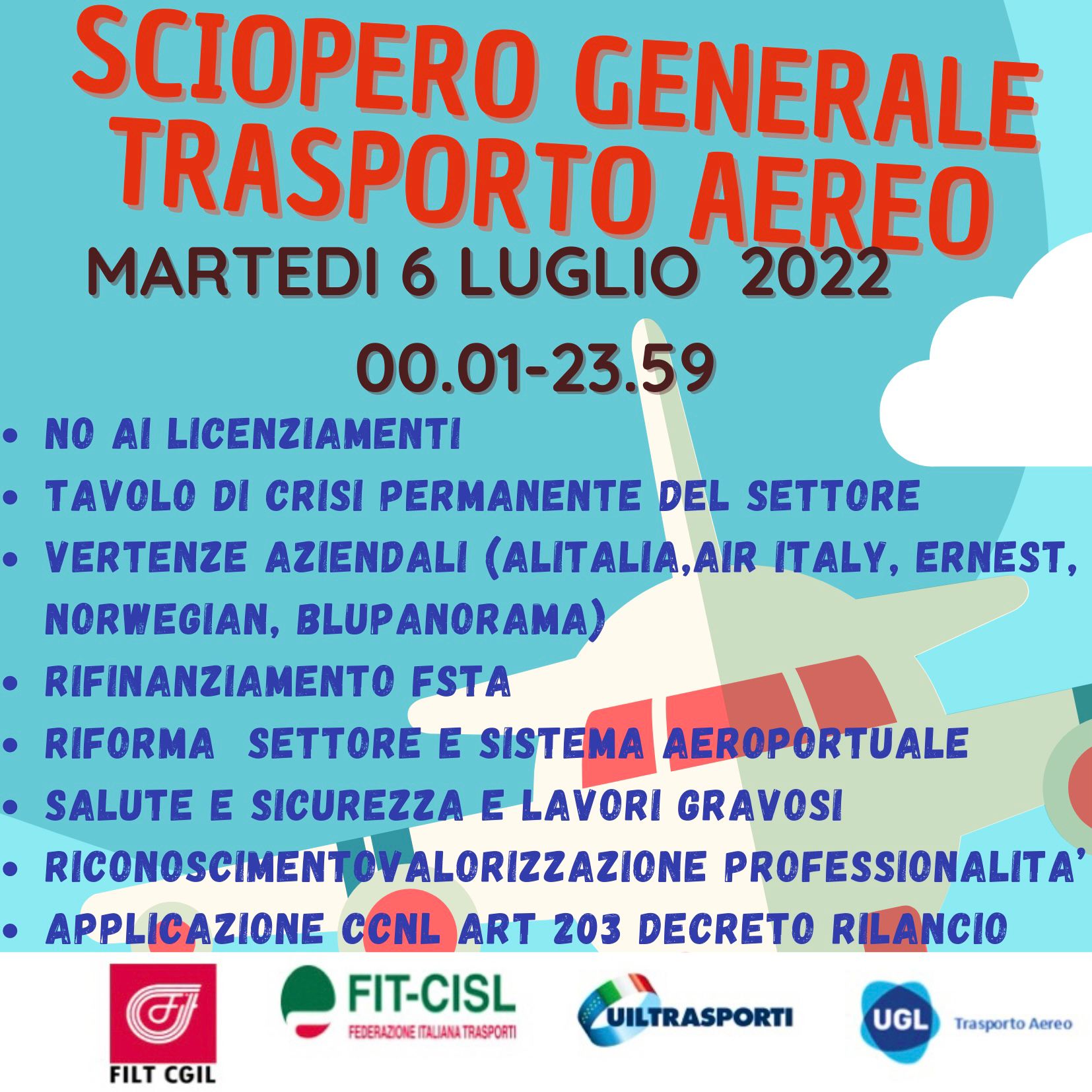Per queste ragioni le scriventi Federazioni Nazionali della FILT CGIL; FIT CISL, UILTRASPORTI e della UGL Trasporto Aereo proclamano azione di Sciopero Nazionale di 24 ore dalle ore 00.01 alle ore 23.59 di tutte le lavoratrici e i lavoratori delle aziende del settore del Trasporto Aereo (esclusa ENAV) per il giorno 6 luglio 2021.